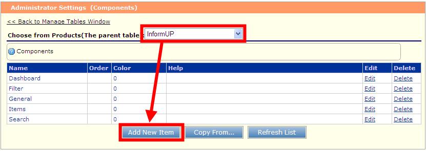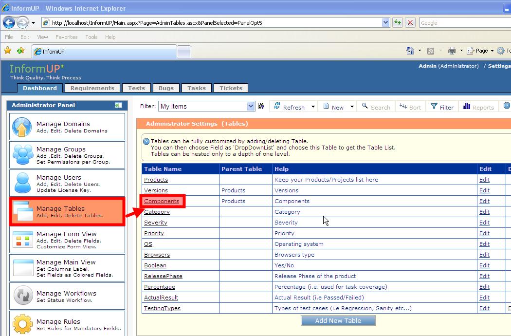 Step 3: Add Components. 1. Click on Manage Tables in the Admin Panel.