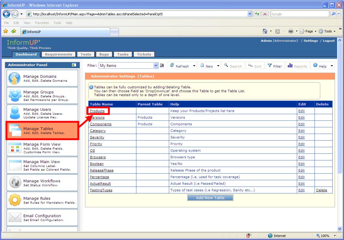 2. Click on Manage Tables in the Admin Panel.