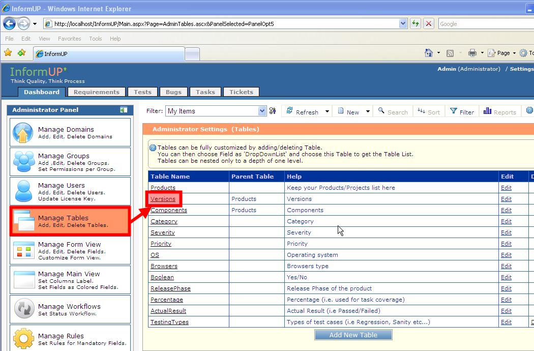 Step 4: Add Versions. 1. Click on Manage Tables in the Admin Panel.